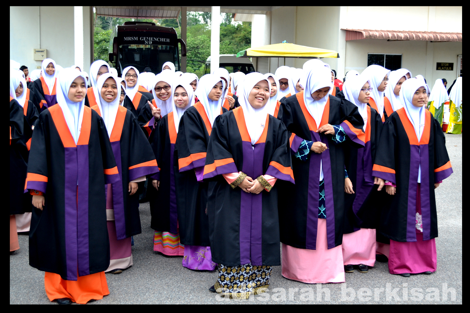 | "Para pelajar semua! Pastikan anda semua tersenyum masa masuk dewan nanti. Jangan masam macam cuka, okay?" |